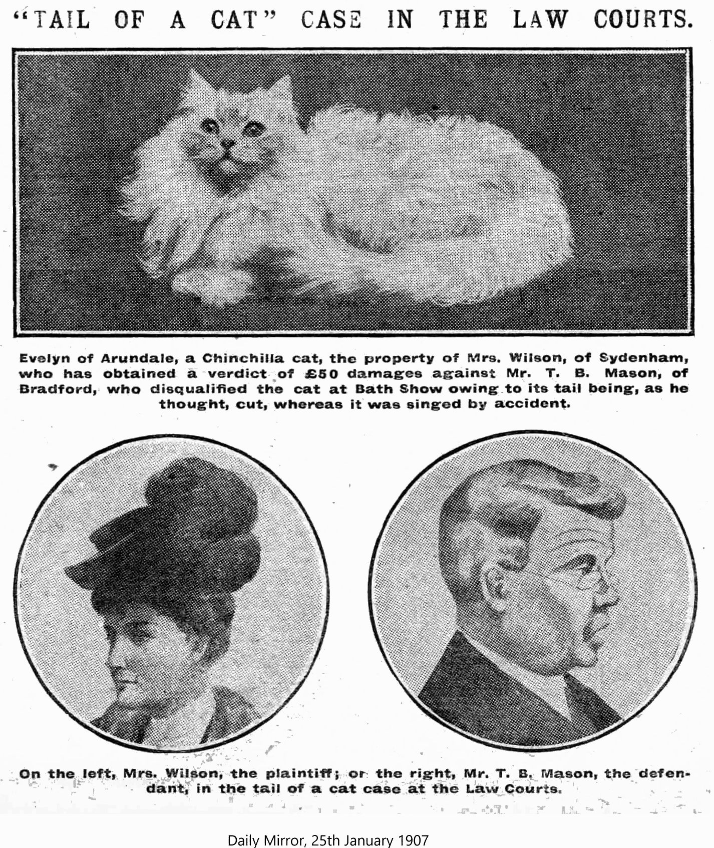 This account has been distilled from a number of publications, in particular the Bradford Daily Telegraph (Tuesday 22nd January, 1907), Yorkshire Evening Post, Globe, Daily Telegraph & Courier (London), Yorkshire Evening Post (Wednesday 23rd January 1907), the Morning Post (23rd & 24th January, 1907) and many others. It even appeared in The Charlotte News (North Carolina) and the El Paso Herald (Texas). The newspapers described it along the lines of “Fancier’s Libel Action. The Tail of a Cat, Exhibitor and Bradford Judge. A Remarkable and Humorous Case. “