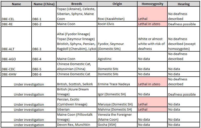 Homozygous DBE-ALT/DBE-ALT are viable and show no abnormalities except deafness for some of them. A single homozygous DBE-CEL/DBE-CEL kitten and a single putative compound heterozygous DBE-CEL/DBE-RE kitten have been reported; both showed limb abnormalities and contractures, abnormal head shape, and died at birth. (My own communications about the Topaz breed during its development, not included in this paper a no cats were available for testing [the cattery was dispersed due to the war in Ukraine], indicate compound heterozygous DBE-ALT/DBE-CEL cats were viable, but had unusual distribution of white, dark-blue or black eyes, premature greying and deafness because the head is wholly white.)