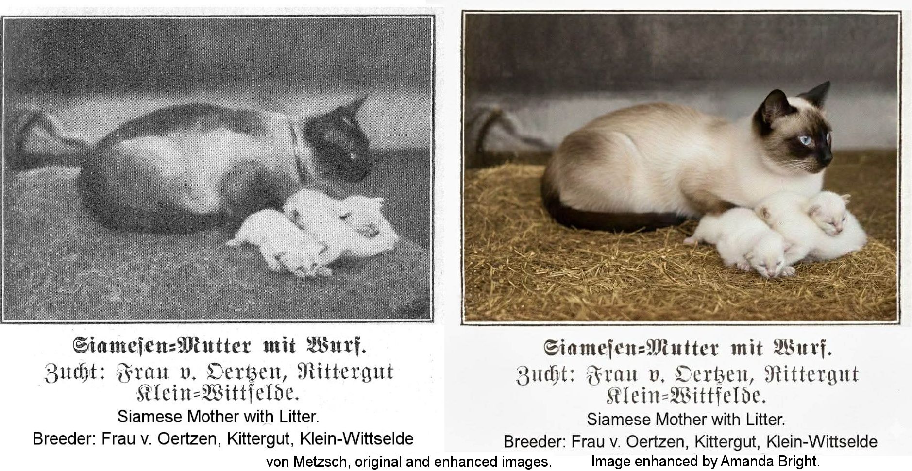 Royal Siamese or Palace Cat, for the reason that it is closest to the domestic cat, in spite of its great peculiarity, and because it appears to us as a brilliant example of the fact that we are certainly not on the wrong track when we German breeders always envisage breeding coloured cats. It will easily to successfully breed beautiful cats in consistent colours, which can then also be called races, and it is probably possible to achieve a perfectly worthy companion to this strikingly peculiar cat, perhaps in silver-grey, one that is an equal to this specimen. First let us try to describe the perfect Siamese cat in words. To start with, the basic colour is isabelline or creamy yellow, one might even say with the slightest hint of red. The shading then becomes deeper fawn-colour at the neck, and on the thighs and legs until it becomes a deep sable-brown on the head and the paws. It also changes from light to very dark as it extends along the tail towards the tip and and similarly on the ears.The reader will now understand what meant when saying it would be possible for breeders to create a cat that had the same variations in tone, but ranged from the lightest blue-gray to blue-black. This would then be a variation of the Siamese cat, and would turn out to be a silver cat, while the current version has more of a gold tint.