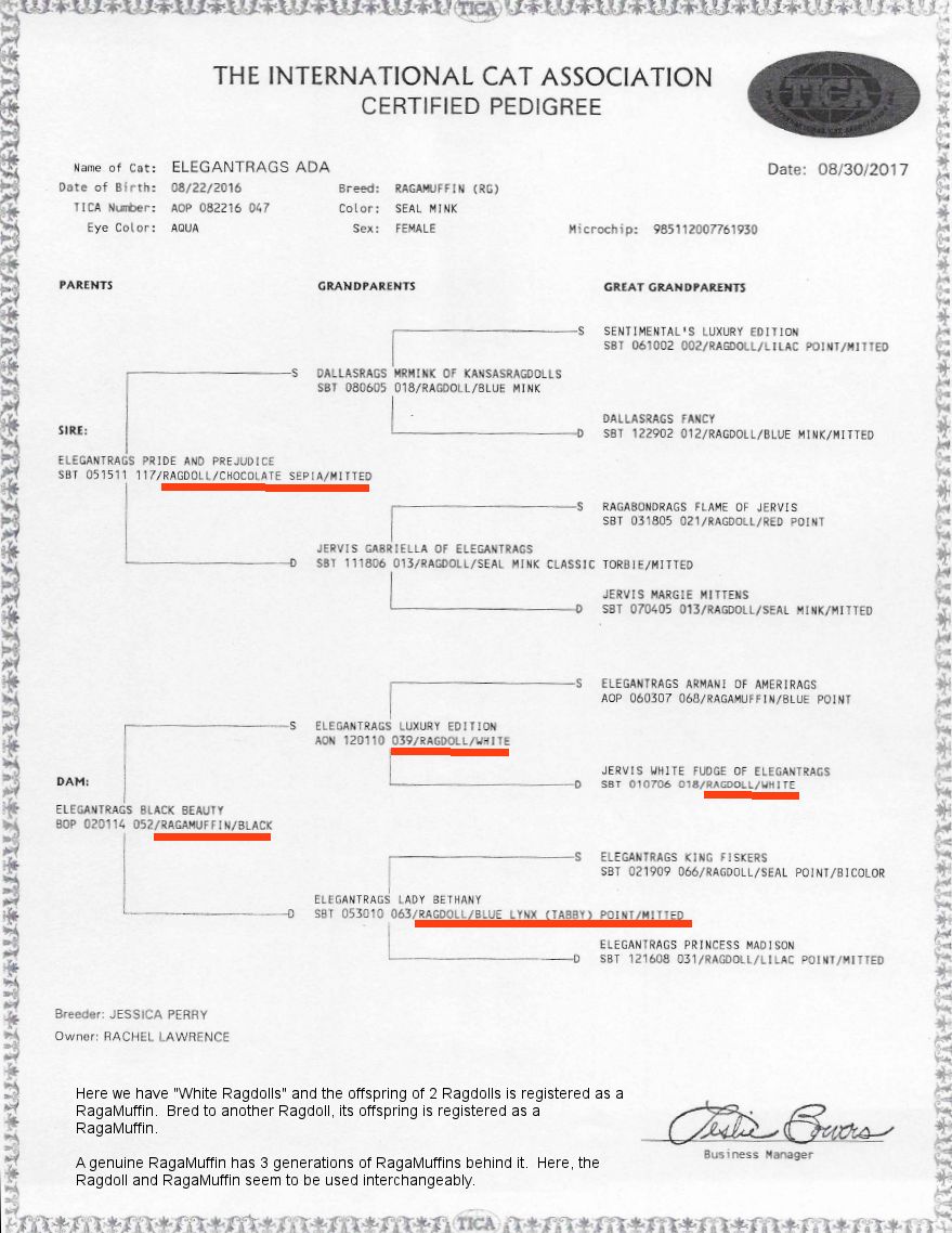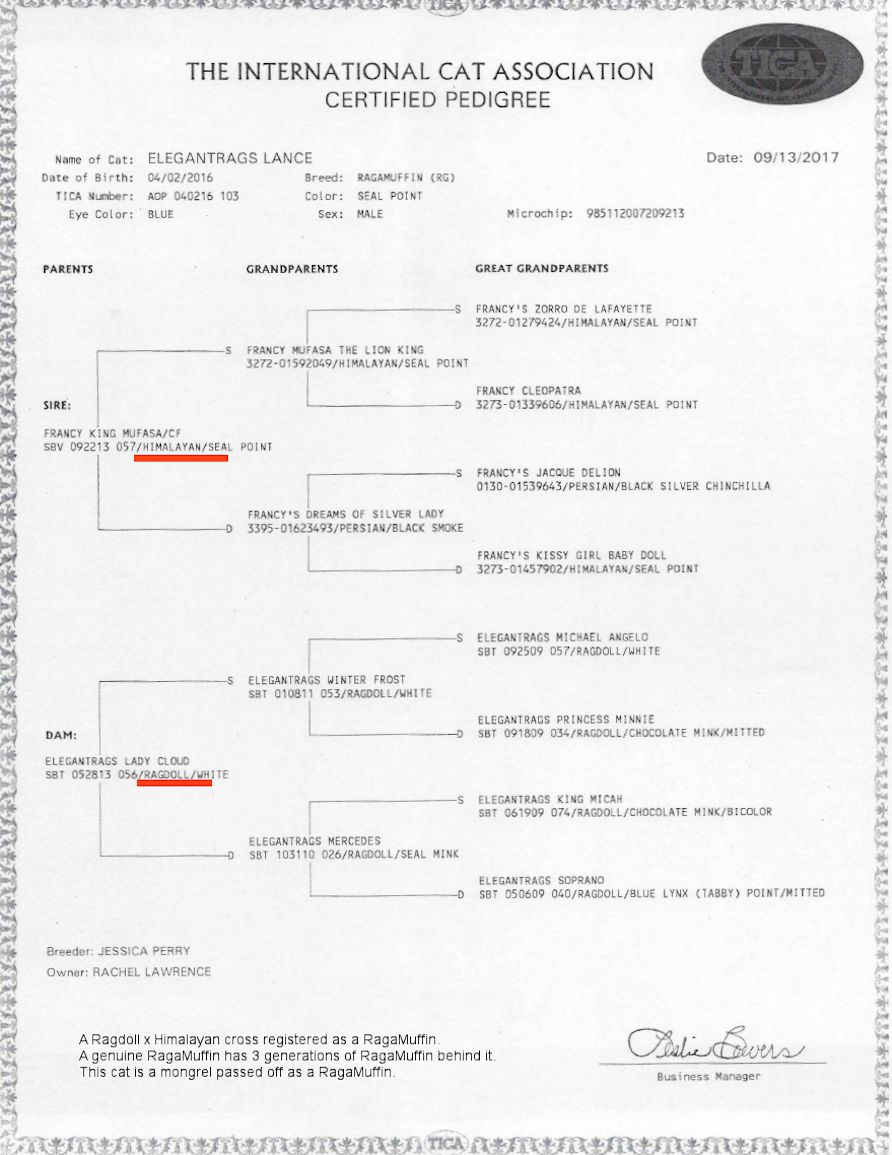 Look at the pedigrees below. All of the cats are registered with TICA as RagaMuffins. None of them are actually RagaMuffins – they are all Ragdoll crosses being passed off as RagaMuffins.