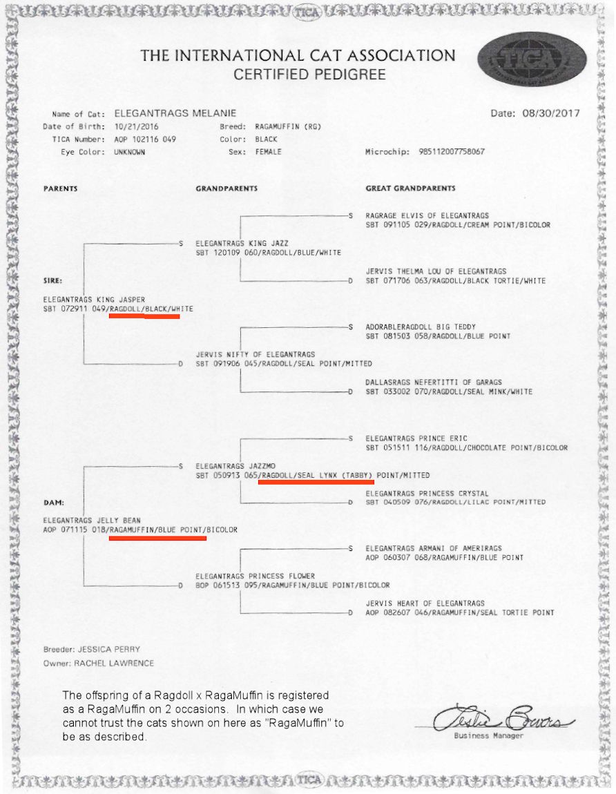 [The notorious breeder, – described as a “cat broker” - Jessica Perry of “We Love Ragdolls,” “ElegantRags” and numerous other aliases, has been subject to a class action lawsuit (against both Jessica Perry and Leah Keeran) over the sale of sick and even dying kittens (no vet papers, no vaccinations, no pedigree papers). The breeder also sold "Calico Ragdolls" (there is no such breed). Perry was last known to be operating out of Wichita, Texas, having previously operated in South Carolina and then to Louisiana. There are numerous consumer/ripoff reports online about the operation. While backyard breeders advertise crossbred kittens as RagaMuffins on selling sites for $200-$500 range, some want up to $875 for Ragdoll/Persian mixes, and Perry asked for $4000 for a pet, $6000 for a breeding cat (that cannot be registered with CFA, ACFA, GCCF, WCF, CCA-AFC) - more than any legitimate RagaMuffin breeder asks. ]