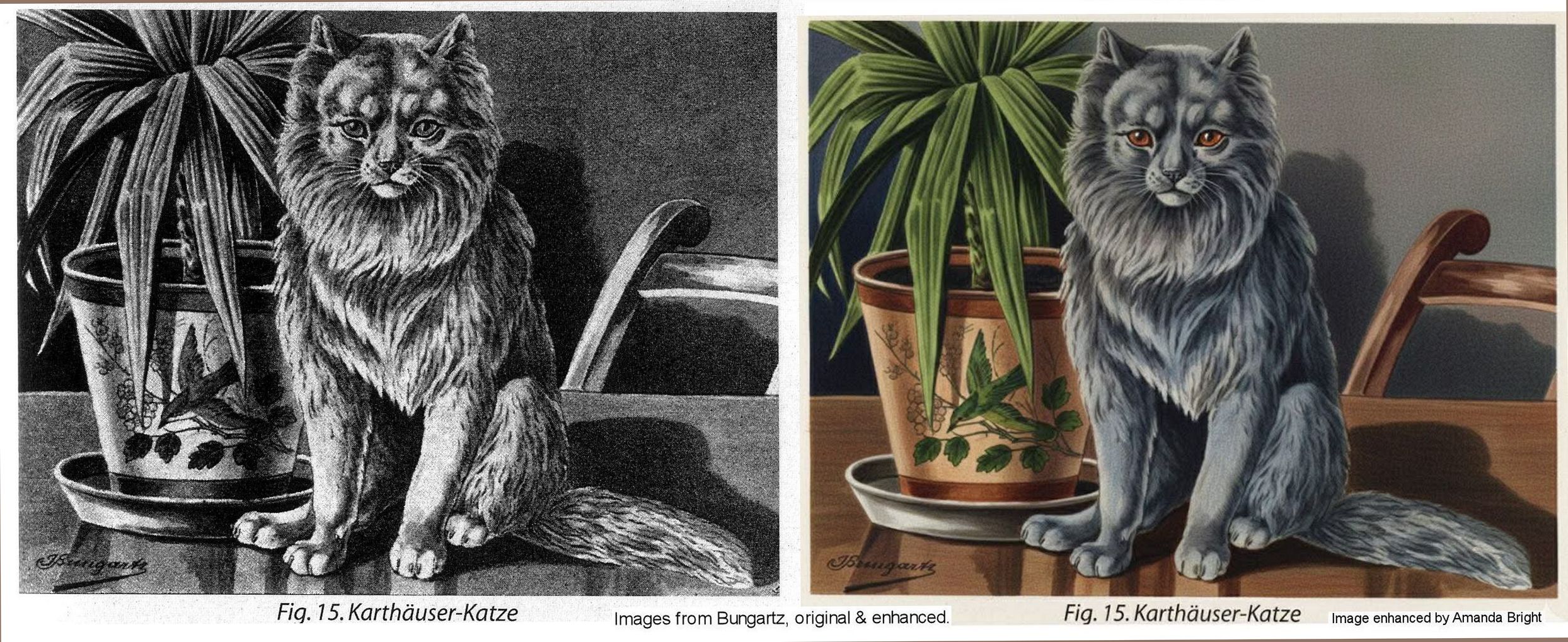 In 1896, Jean Bungartz wrote is his "Illustrated Book of Cats" (in German only): The Carthusian cat is a self-coloured blue variety with long fine hair, black lips and soles. The blue colour varies from bluish ash-grey to bluish. If the colour is pure and the hair is in good care, then the Carthusian is considered a most magnificent animal, but its character is somewhat phlegmatic, a characteristic it shares with other longhair cats: the Angora, the Persian and the Chinese cat. Iceland or Kumani cat and similar designations are, are almost identical to the previous variety. The Iceland cat is characterised by beautiful bluish grey colouring of the skin; the Kumani cat, originating from the Caucasus, however have thick hair of white, black or rust-red color; lips and soles are flesh colour ...The following cats may be so similar to the common housecat that they differ only by colouring. For example, the cat of Iceland is beautifully bluish gray, the Tobolsk cat from Siberia is red or fox-colored, those from the Cape of Good Hope are blue or red."