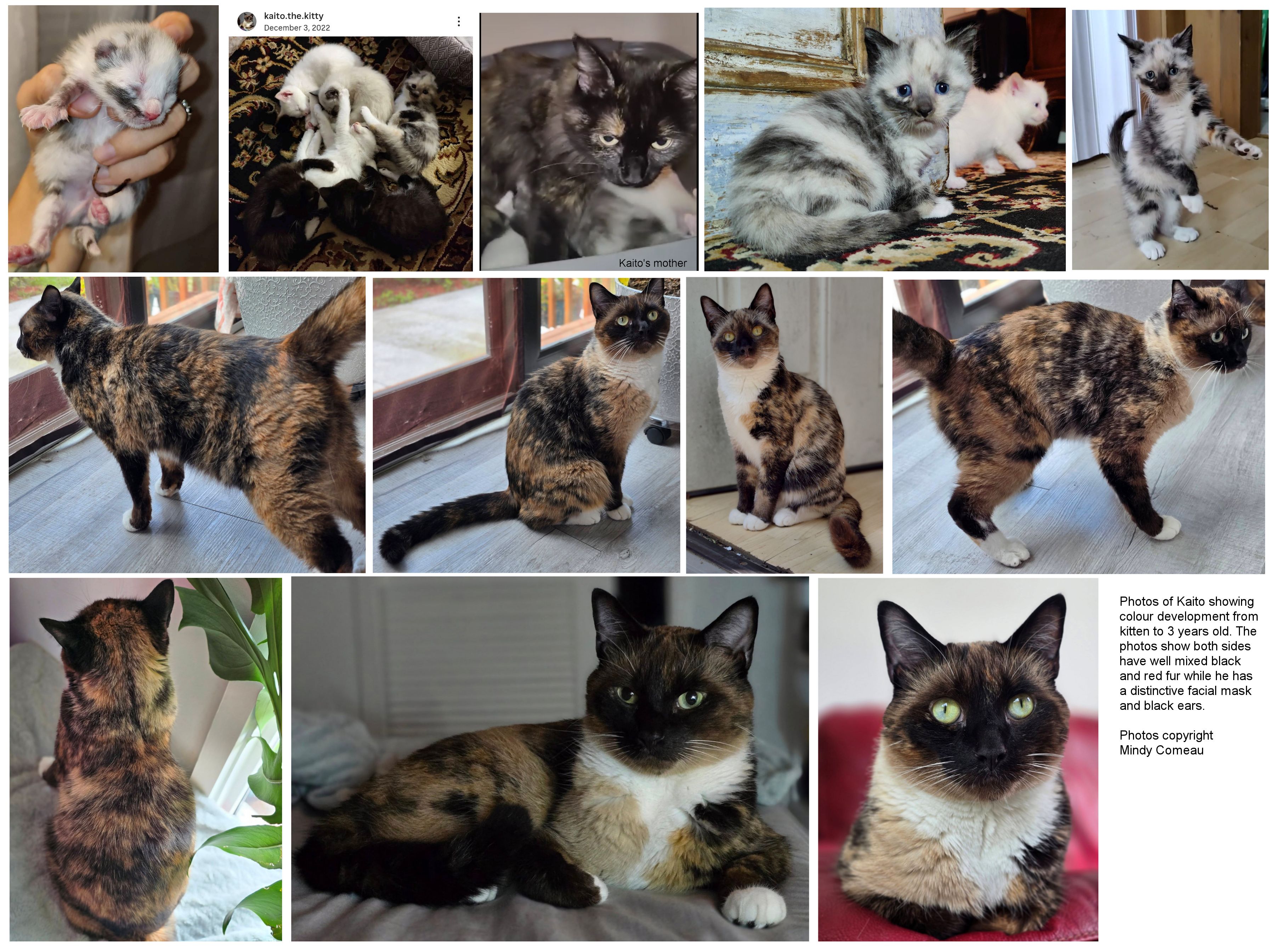 Kaito was born in 2022 and is owned by Mindy Comeau who provided this information in January 2026. As a kitten, Kaito had pale colouring, suggesting either fever coat (pigment not developing properly in utero) or that his adult colour would be either seal point or seal mink. He had a colourpointed sibling. His mother was a long-haired black tortie stray, and from the available photo appears sepia or mink because her face and lower legs are more intense in colour than her body. She had previously had litters sired by unknown males outdoors; these included colourpoint kittens and also albino kittens with birth defects or which didn't survive. This means she carried one copy of the colourpoint gene. The colourpointqand albino kittens suggest she was mating with her own sons, which could also account for the albino kittens having birth defects. Her litters could contain kittens from more than one father.