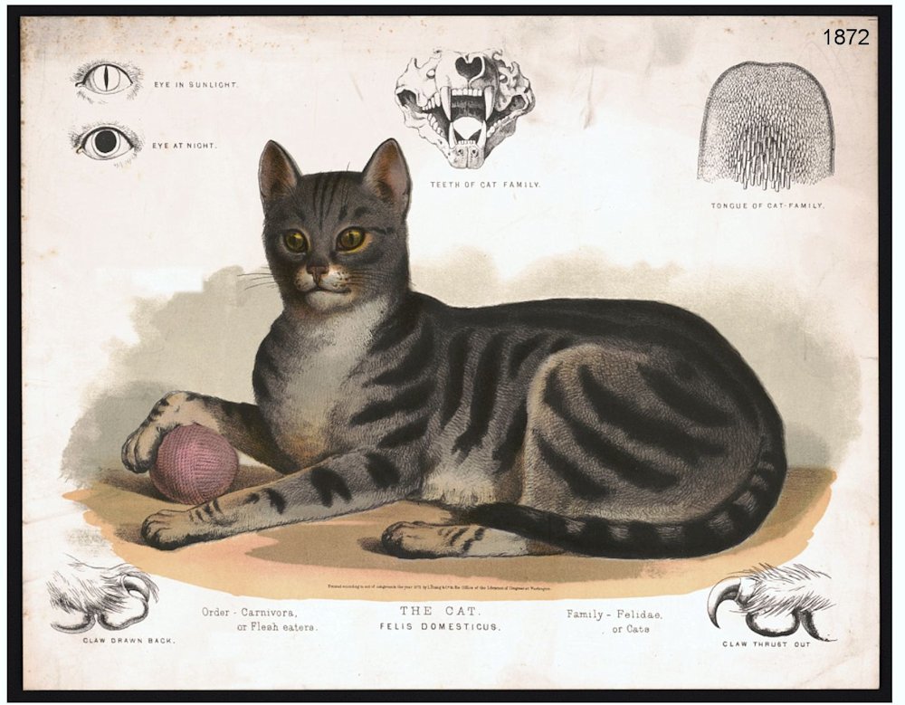 EXCERPTS FROM "ILLUSTRATED NATURAL HISTORY" BY REVEREND JG WOOD (1853) WHEN ENGAGED in the study of an illustrated work on ethnology, with its portraits of the various forms which are assumed by the human race, a certain feeling of relief and repose takes possession of the mind when the reader turns from the savage races of mankind, with their selfish, restless, eager, bestialized expression, to the mild and intellectual countenances of the civilized nations. A similar sensation of repose is felt when we turn from the savage, hungry-looking Wild Cat to the placid face and tranquil expression of our favourite, the DOMESTIC CAT. Although this country possesses an indigenous Cat, which would naturally be considered as the original progenitor of the Domestic Cat, which attaches herself so strongly to mankind, it is now generally admitted that for this useful and graceful animal we are indebted to another continent. In the description of the Wild Cat, it has been mentioned that the distinguishing marks which characterize the two species are so permanent as to defy eradication, and to mark decisively the Felis Catus [European Wildcat] from the Felis Domestica. The comparative length of their tails is of itself a distinction, and one which seems never to be lost by either the wild or the domestic animal. Whether those two creatures have ever produced a mixed breed is a matter of much uncertainty, for although a wood or a warren may be infested with cats living in a wild state, yet, in almost every case, they are only Domestic Cats in which the savage part of their nature has predominated, and conquered the assumed habits of domestication. They have acted as men sometimes act under similar temptation, and have voluntarily taken to a savage life. As far as is at present known, the Egyptian Cat, for which see p. 192, is the origin of our Domestic Cat. In the long past times, when the Egyptian nation was at the head of the civilized world, the Fells maniculata [Egyptian Cat] was universally domesticated in their homes, while at the comparatively later days of English history the Domestic Cat was so scarce in England that royal edicts were issued for its preservation. Yet in those days, A. D. 948, the wild Cat was rife throughout the British Islands, and was reckoned as a noxious animal, which must be destroyed, and not a useful one which must be protected. It is conjectured that the Domestic Cat was imported from Egypt into Greece and Rome, and from thence to England. In the eyes of any one who has really examined, and can support the character of the Domestic Cat, she must appear to be a sadly calumniated creature. She is generally contrasted with the dog, much to her disfavour. His docility, affectionate disposition, and forgiveness of injuries; his reliability of character, and his wonderful intellectual powers are spoken of, as truly they deserve, with great enthusiasm and respect. But these amiable traits of character are brought into violent contrast with sundry ill-conditioned qualities which are attributed to the Cat, and wrongly so. The Cat is held up to reprobation as a selfish animal, seeking her own comfort and disregardful of others; attached only to localities, and bearing no real affection for her owners. She is said to be sly and treacherous, hiding her talons in her velvety paws as long as she is in a good temper, but ready to use them upon her best friends if she is crossed in her humours.